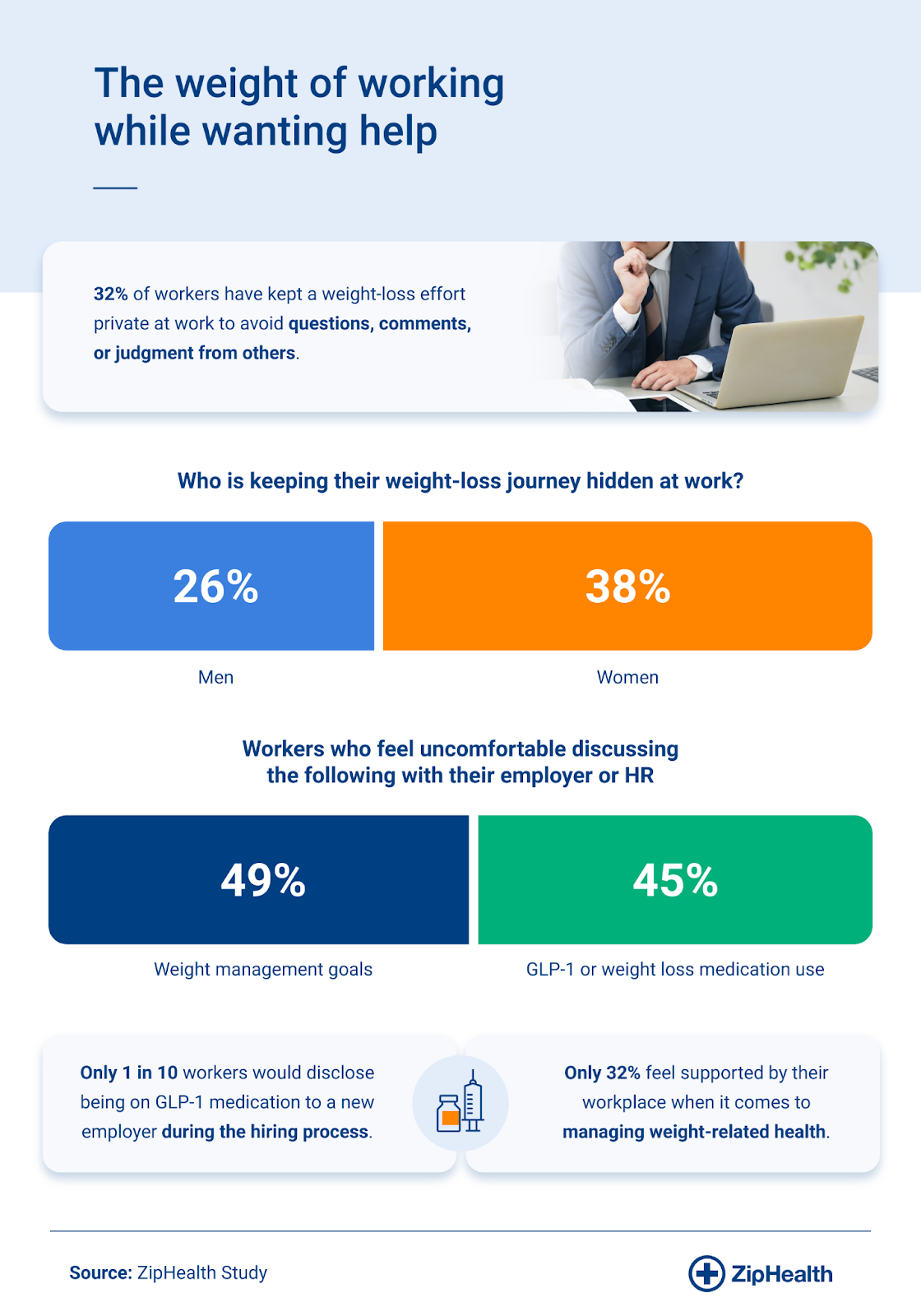 - 32% of workers have kept a weight-loss effort private at work, and only 1 in 10 would disclose being on GLP-1 medication to a new employer.