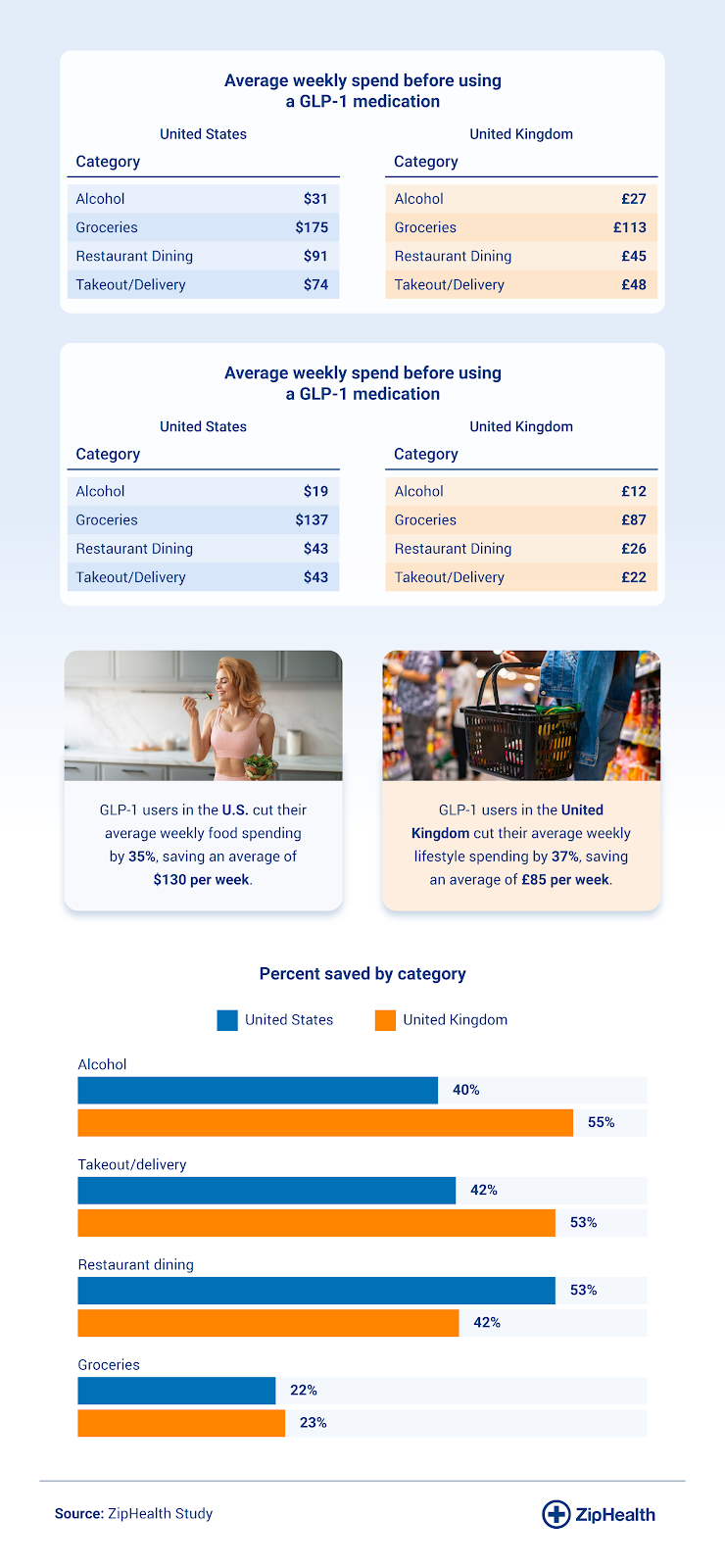 - GLP-1 users in the US and U.K. cut their weekly food and alcohol spending by an average of 36%, saving up to $6,754 and £4,425 annually