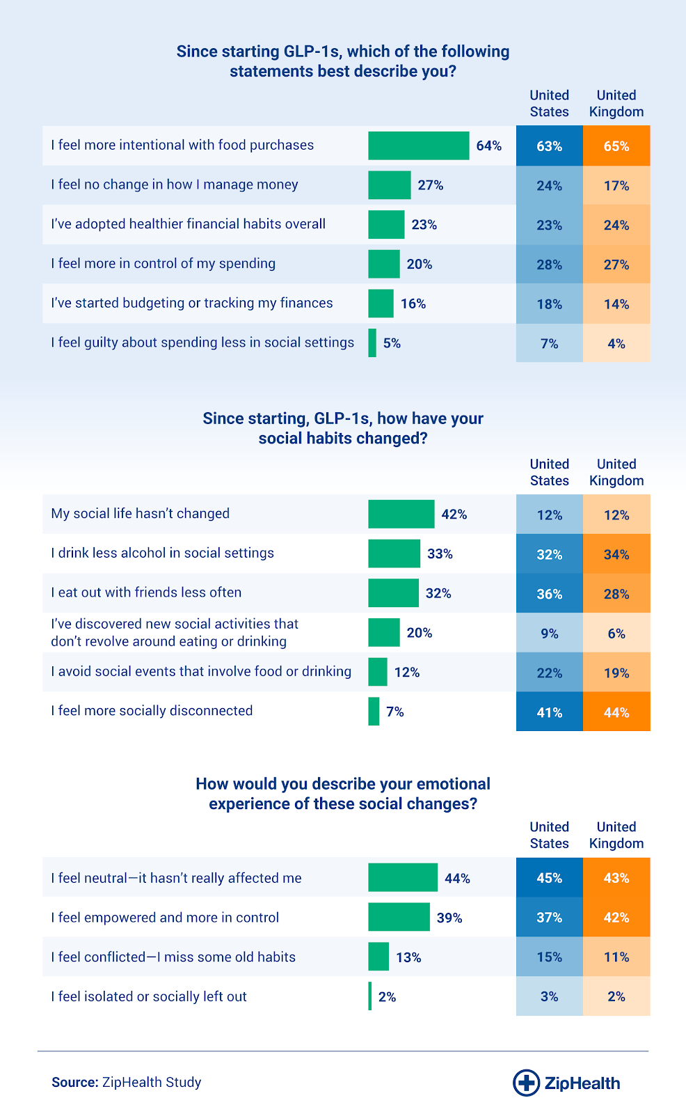- 64% say they’re more mindful with food purchases, and many are budgeting or tracking finances since starting GLP-1s.
