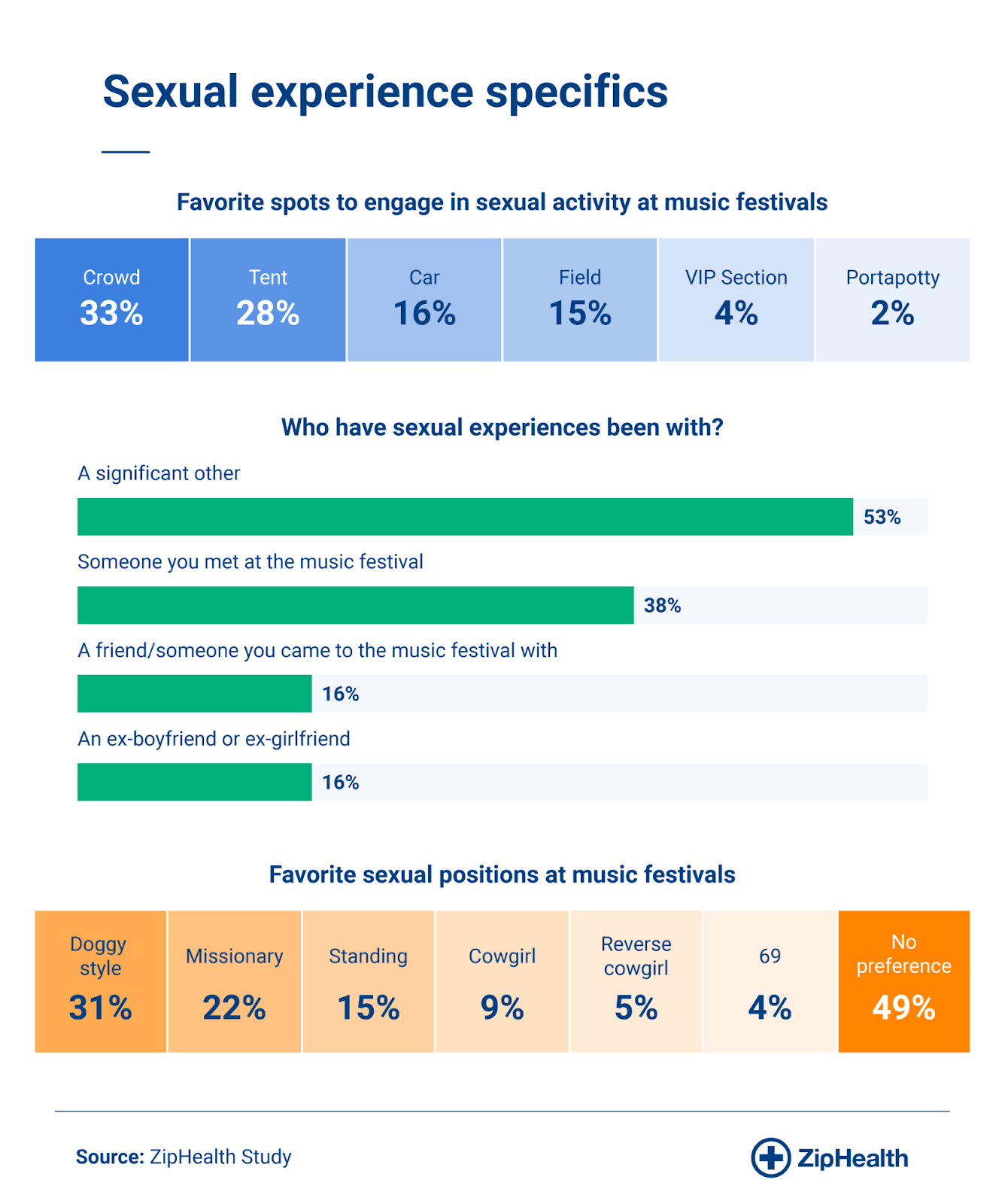- Favorite spots to engage in sexual activity at a music festival: the crowd (33%), a tent (28%), and a car (16%).