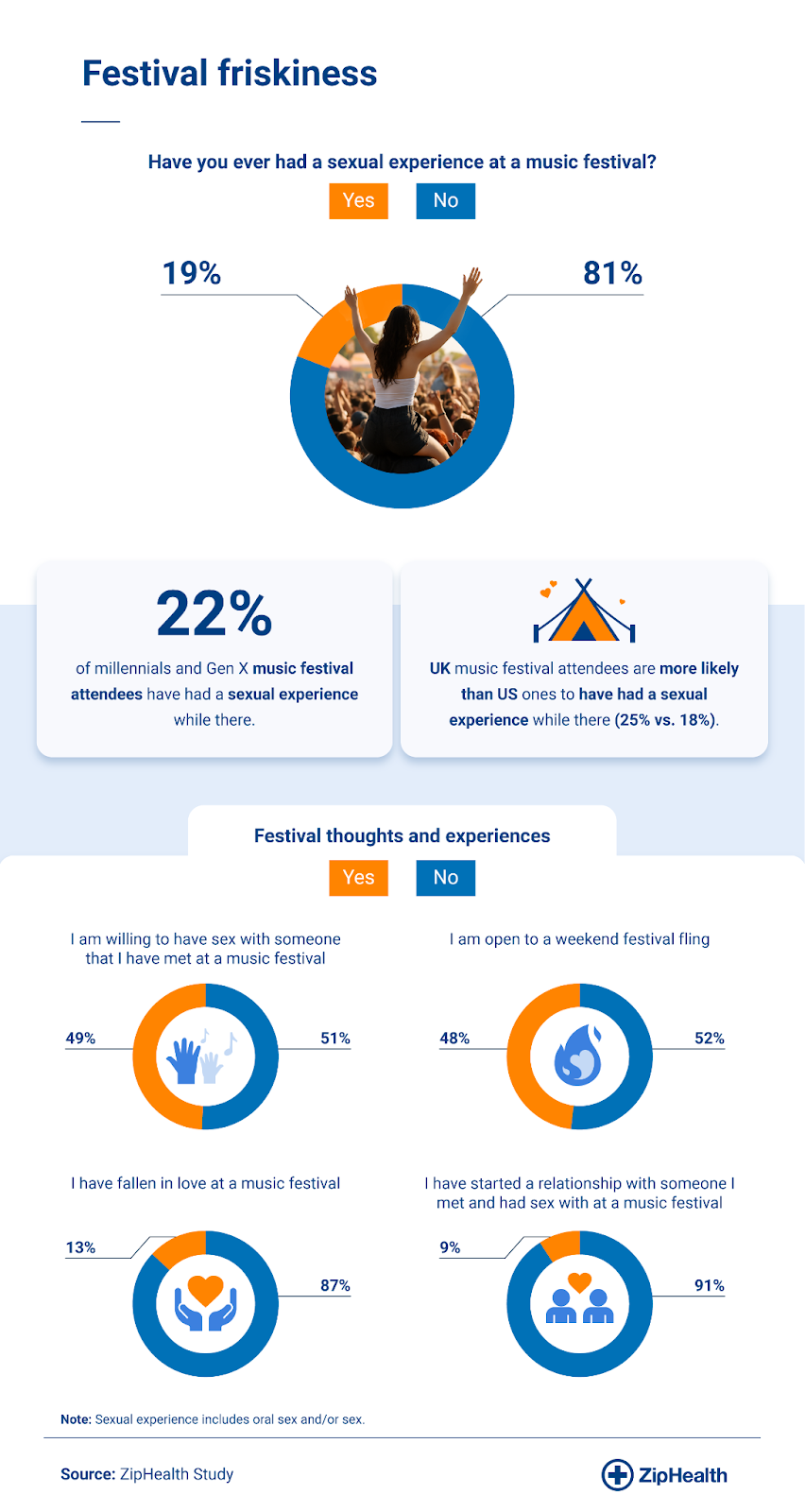 - Nearly 1 in 2 music festival attendees (49%) are willing to have sex with someone that they have met at a music festival.