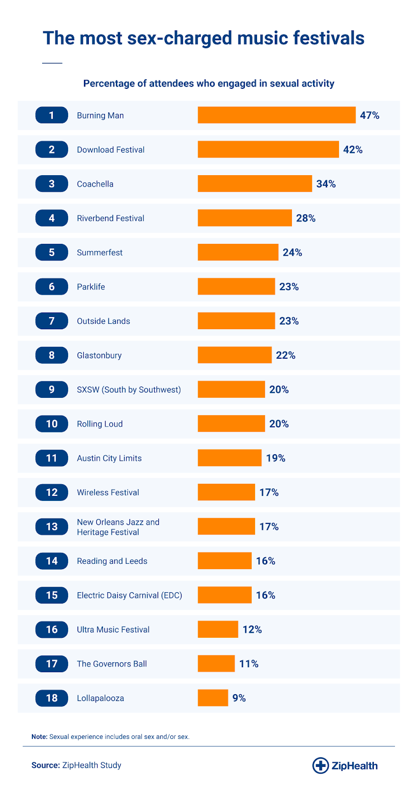 - Burning Man is the most sex-charged music festival, with 47% of attendees engaging in sexual activity while there, followed by the Download Festival at 42%.