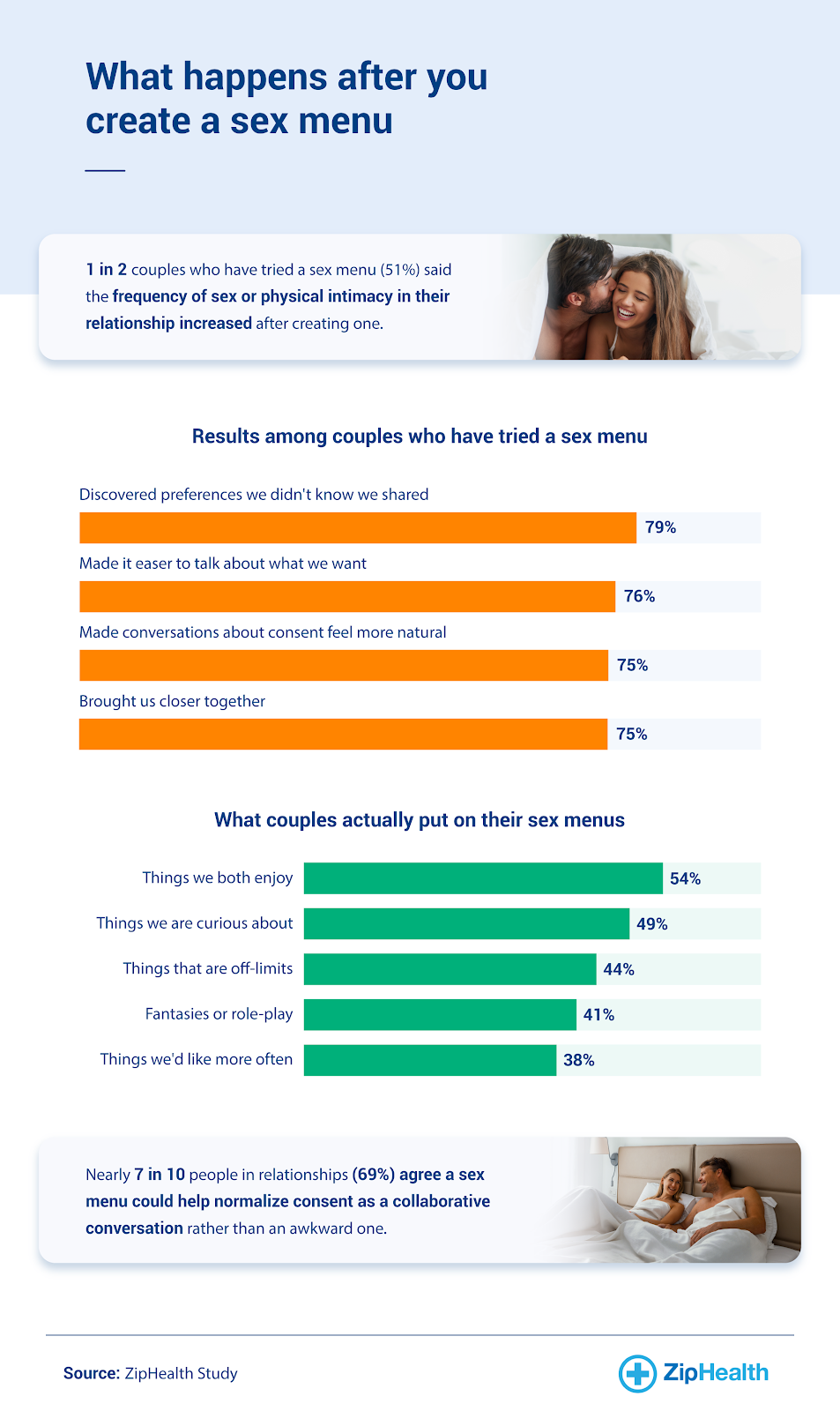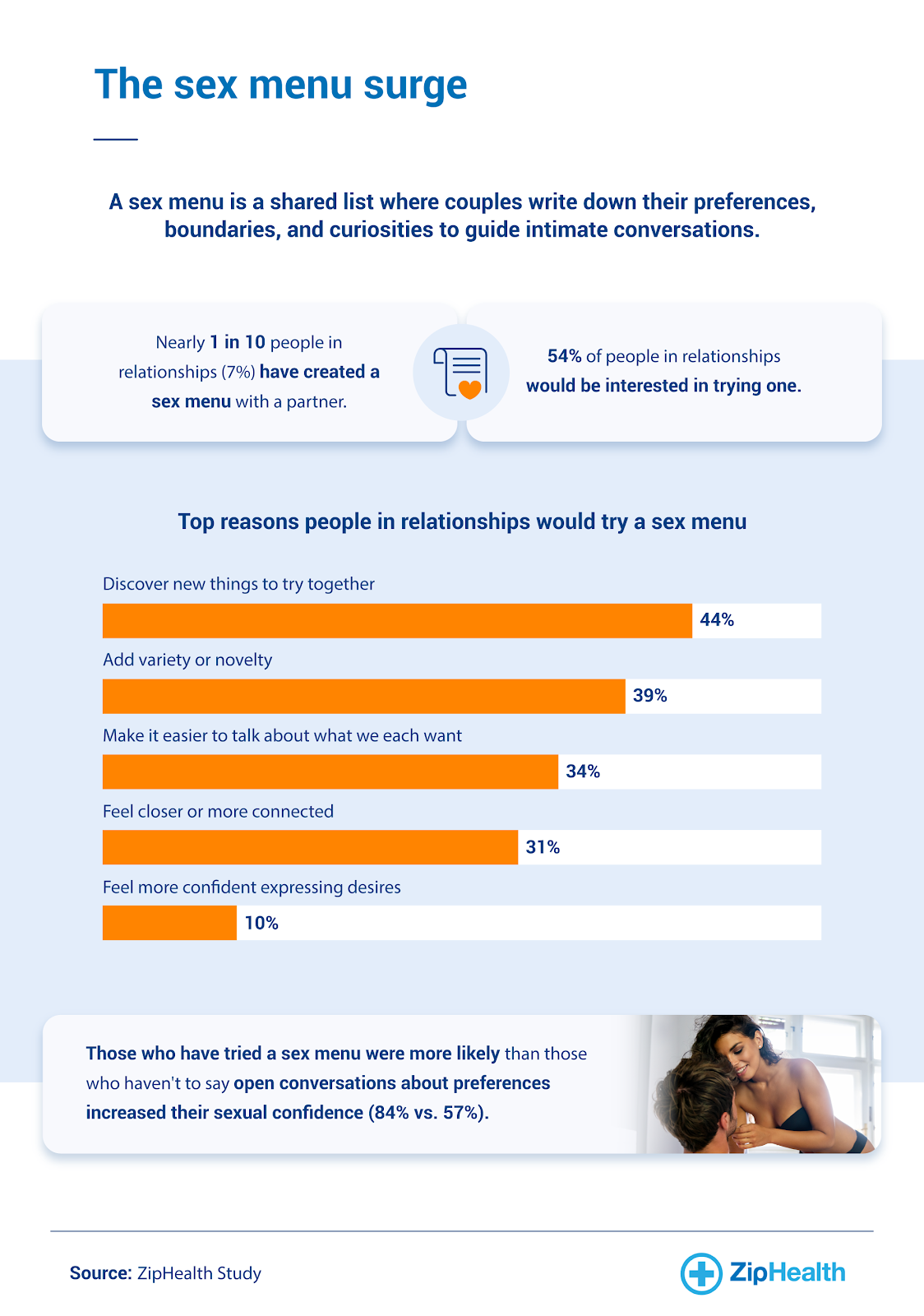 Talking openly about intimacy is getting a lot less taboo, and more couples appear ready to make those conversations even clearer. ZipHealth's survey of 1,008 adults in relationships across the US and Canada looked at how people discussed sexual preferences, whether they had created a "sex menu," and what happened when they did.
