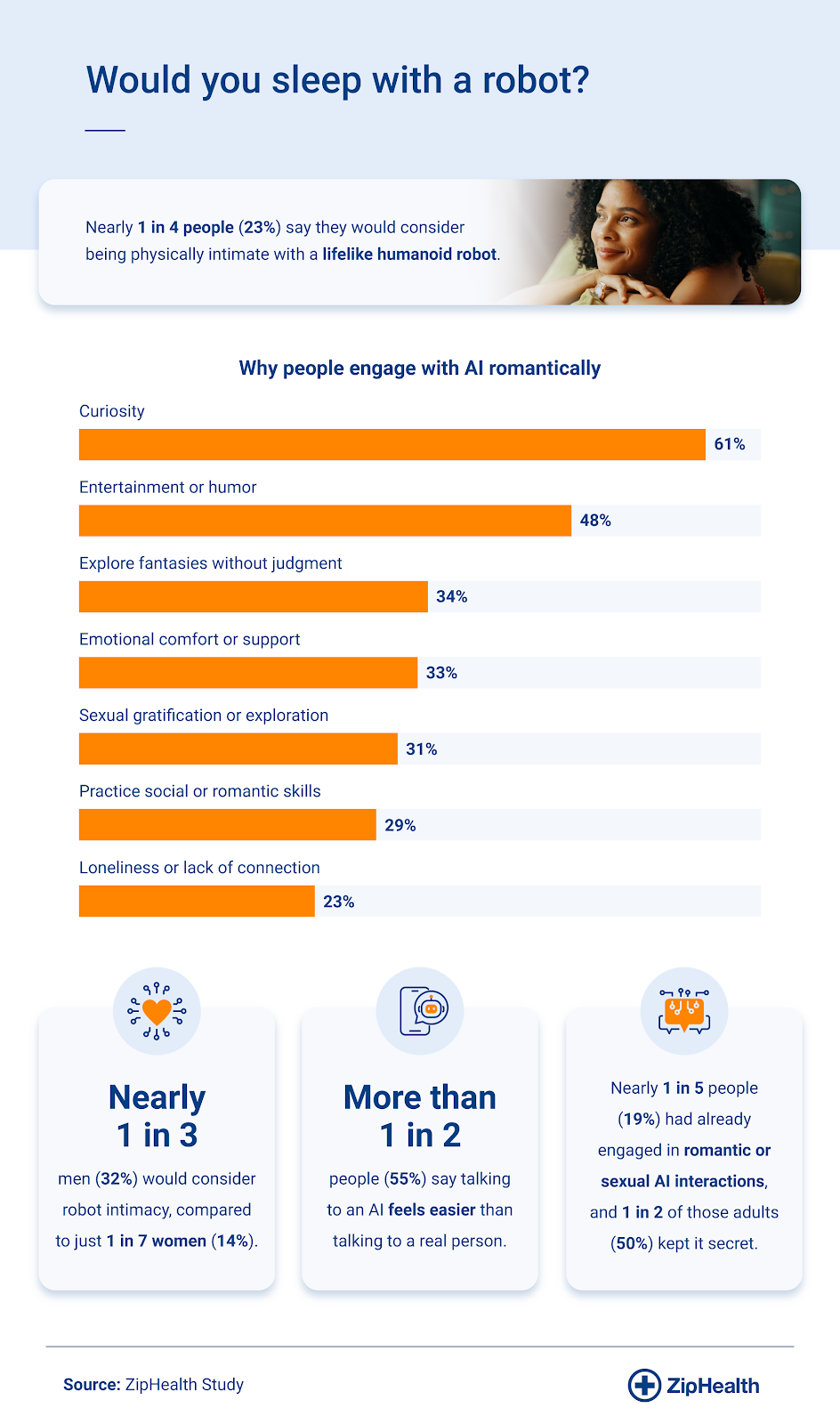 AI is starting to blur the line between tool and companion. A lot of people are not just noticing that shift, but imagining what it could mean for dating, sex, and emotional support. To explore this new phenomenon, ZipHealth surveyed over 1,000 Americans and Canadians about romantic AI interactions and how AI companionship could affect real-world relationships and sexual health.